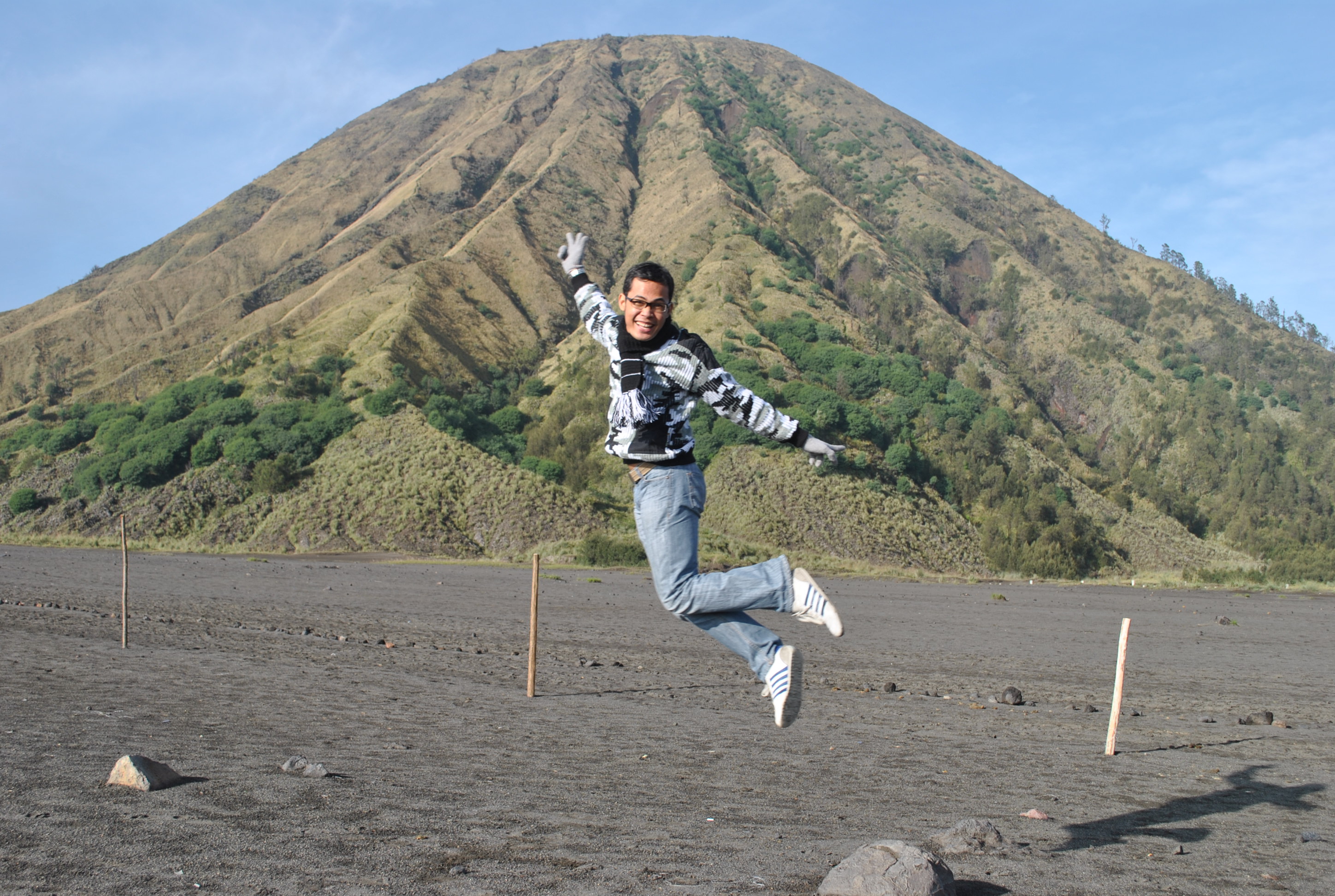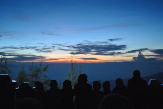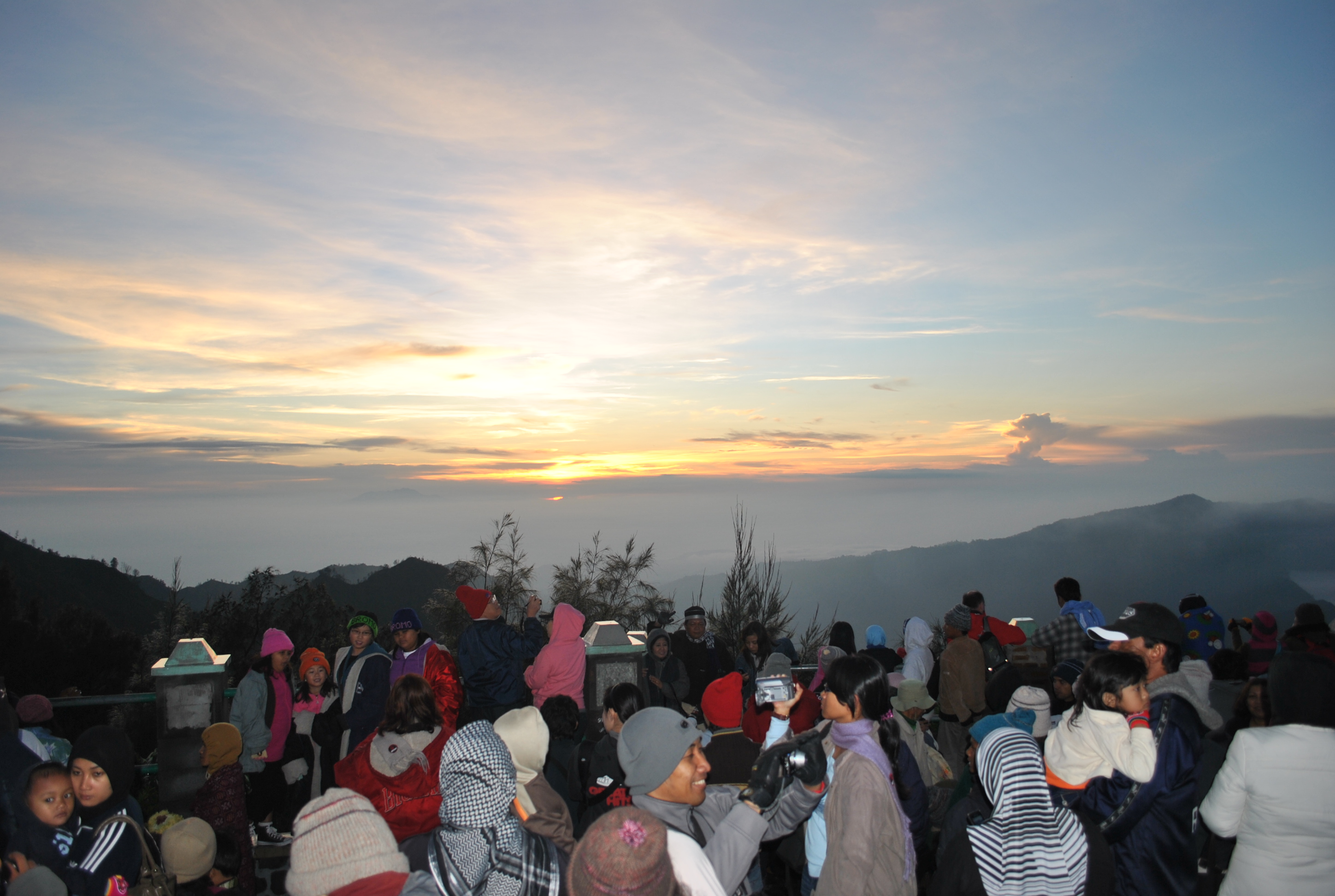 Alhamdulilah,tepat tengah malam landing di kaki gunung,langsung sajah beberapa pencari nafkah menyerbu menawarkan komoditas.Hmm…setelah melalui diskusi yang cukup serius,akhirnya memilih menyewa jeep kapasitas untuk 6 orang dengan 4 lokasi tujuan,penanjakan-kawah-pasir berbisik-padang savana,dipatok harga 600rb udah bersih dari apapun (karcis masuk,dll). Ada juga tawaran untuk 2 lokasi tujuan,hanya 350rb sajah. Silakan pilih sendiri 🙂 Dan dimulailah perjalanan inih,mo liat sunrise ni di penanjakan,jalan yang dilalui tak semulus kulit para publik figur,gelap gulita terbayang kanan kiri jurang tak bertepi tapi setelah kembali menyusuri jalan itu di siang hari,ngakak lah qta kawan,tnyata tak seperti dugaan kanan kiri bukan jurang melainkan hamparan tanah lapang berkelok-kelok,ada yang emang bertepi jurang juga seh 😀 Lah kok saya ya sempet-sempetnya ngantuk n terlelap sekejap,persneling jeep disamping lutut yang kadang mengeluarkan bunyi keras menghentak mimpi saya he2. Kira-kira hampir sejam lah smpe d penanjakan,musti jalan kaki naek ke puncak,gelap gulita juga nih jadi bergumam esok klo ksini lagi musti bawa senter kekna. Smpe puncak jugak ni critanya,nebeng penerangan rombongan ekspatriat yang dihantarkan tour guide, huff gelap banget pandangan mata cuma mampu mengalahkan jarak 2 langkah sajah,hmmm banyak juga para pencari keindahan diatas sini makin lama makin bertambah. Entah berapa lama qta berpijak di penanjakan sampai-sampai puluhan potret diri dan alam terekam Nikon D3000 🙂