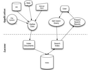 Pengguna baru Lucene sering melakukan kesalahan menganggap sebagai sebuah aplikasi yang siap digunakan seperti program file-search, web crawler,atau website search engine. Itu bukan Lucene,Lucene adalah sebuah software library,sebuah toolkit, bukan fitur lengkap aplikasi pencarian. Hal ini berkaitan dengan text indexing dan searching, dan melakukan hal-hal itu dengan sangat baik. Lucene memungkinkan aplikasi berurusan dengan business rules yang khusus pada permasalahan domain ketika menyembunyikan kompleksitas implementasi indexing dan searching dengan penggunaan API yang mudah. Lucene dapat diilustrasikan sebagai layer aplikasi pada gambar dibawah ini :