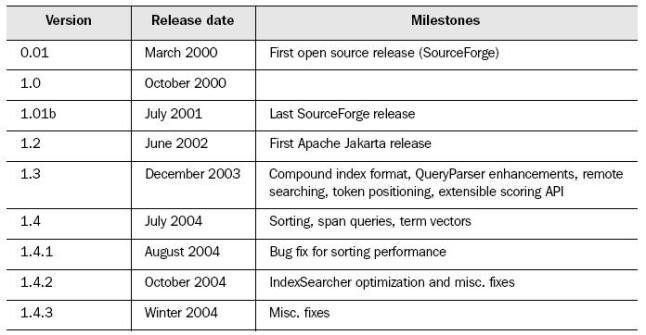Lucene pada awalnya ditulis oleh Doug Cutting; pada awalnya tersedia untuk download dari situsnya SourceForge. Bergabung dengan Apache Software Foundation’s Jakarta family of high-quality open source Java products pada September 2001. Dengan setiap rilis sejak saat itu, proyek ini telah mengalami peningkatan visibilitas, menarik lebih banyak pengguna dan pengembang. Pada Juli 2004, Lucene versi 1.4 telah dirilis, dengan bug fix 1.4.2 dirilis pada awal Oktober, Tabel dibawah menunjukkan sejarah rilis Lucene.