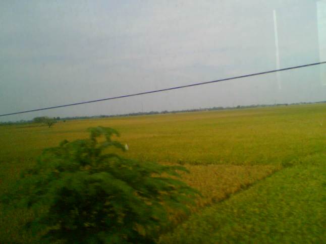 Ulat besi ini melaju makin kencang meninggalkan kota jakarta yang menyimpan sejuta peristiwa, rekan satu seat lagiy asik sendiri mainanΒ PS2 dek pinjem dunk hihi ngarep bgt seh saya, heeemmmm enaknya cuman tidur klo kek giniΒ π **dasar tukang molorrr.Β sejam dua jam tiga jam terlewati dengan buaian mimpi (uugghh knapa musti kebangun seh π¦ ) anehnya knapa saya gak bisa tdur lagiy yak,biasanya separuh perjalanan saya habiskan dengan merenda mimpi diiringi derak roda kereta api diatas rel (emang kereta api punya roda yak π ) sampe mana ini ya,melongok jendela kok yang terlihat hamparan karpet alam yang hijau menyenangkan,subhanallah π this is it,cekidot kawan ni hamparan sawah menguning klo gak salah pas di daerah cirebon deh (maapkeun saya lupa)