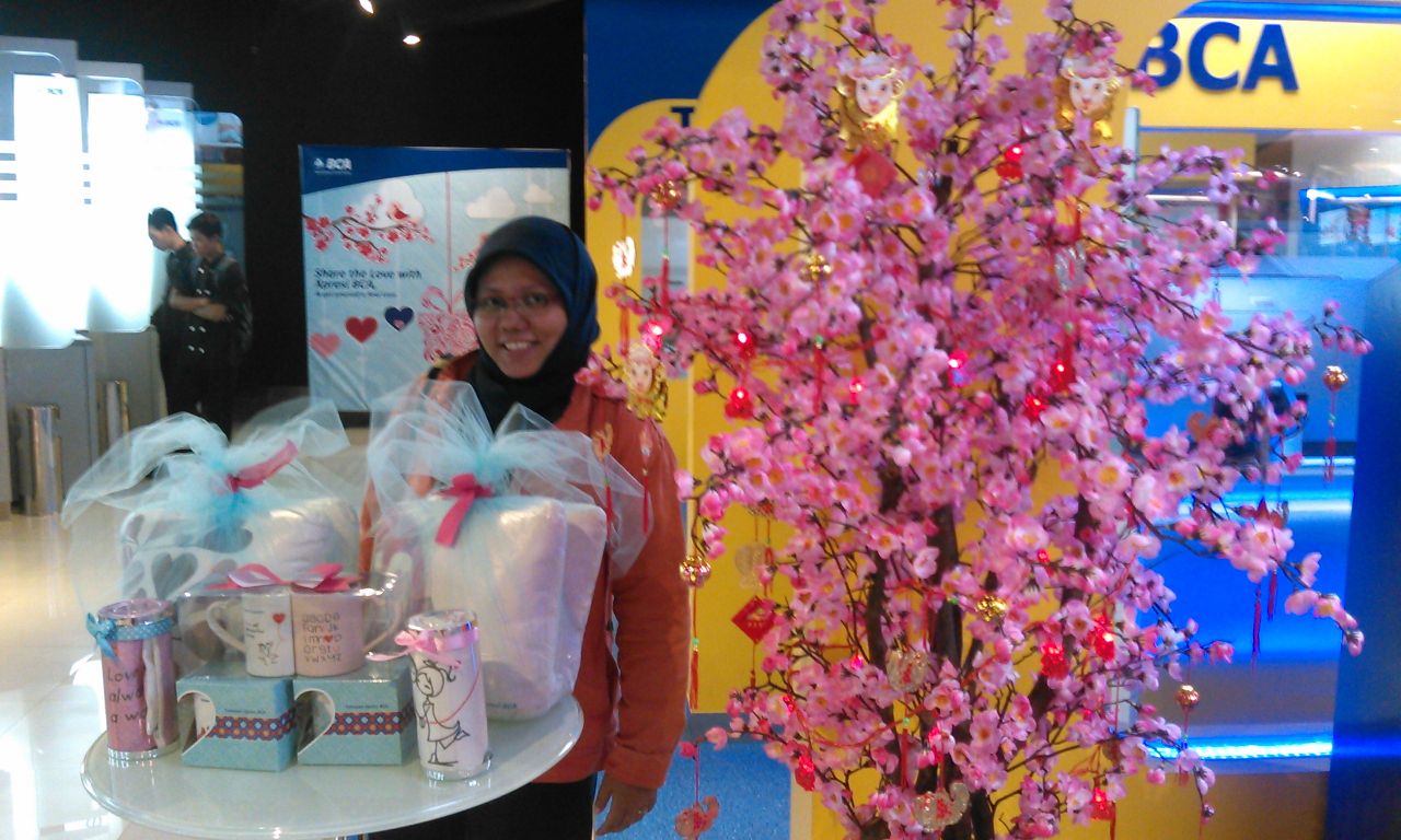 “Di bulan Pebruari ini, Tahapan Xpresi BCA mengeluarkan 3 disain kartu bertema valentine. Disain ini terbatas hingga 15 Maret 2015 saja. Kalo buka rekening baru bisa dapat hadiah langsung mulai dari mug, bantal couple, totebag. Ada lagi, kalo setoran awal minimal 250.000/orang berhak mendapatkan 1 voucher nonton di XXI.” duty officer menjelaskan detil.