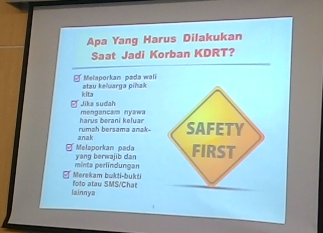 JpegTujuan utama dari acara ini adalah memberikan edukasi kepada masyarakat khususnya wanita. Maka dengan membeberkan kisah dua pembicara ini, diharapkan mampu membuat wanita-wanita tersadar dan tidak lagi hanya nangis dipojokan namun lebih gigih memperjuangkan diri dan keluarganya terutama anak. KDRT masih menjadi selubung dalam rumah tangga, tak banyak orang luar yang mengetahuinya karena biasanya pasutri ini sepakat menyembunyikannya.