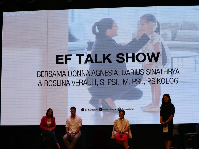 Talkshow kali ini dipandu psikolog ternama Mbak Roslina Verauli, S.Psi, M.Psi yang lebih akrab dipanggil mbak vera, sekaligus ditemani Brand Ambassadors EF yakni pasangan selebriti yang femes banget dan saia ngefans banget hihihi, Mbak Donna Agnesia dan Mas Darius Sinathrya π