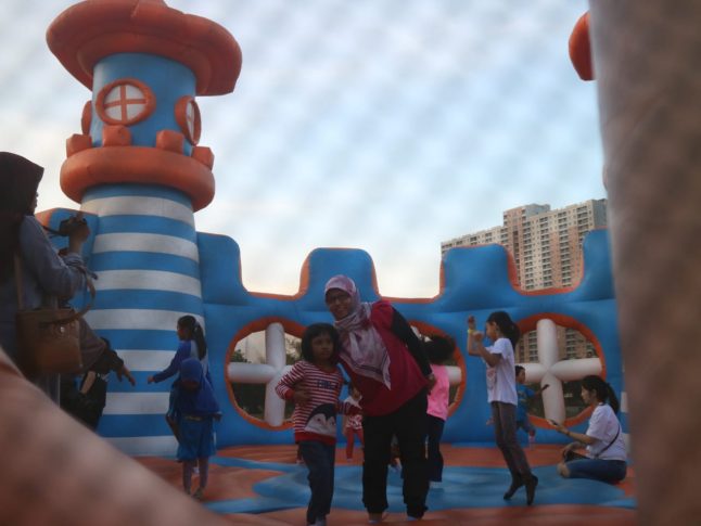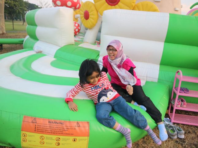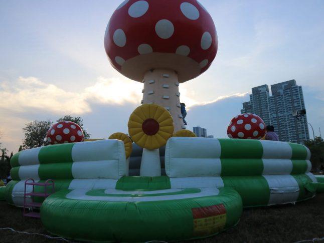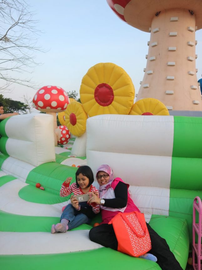 Mushroom nya bisa dipanjat semacam panjat dinding gitu, tapi begitu saia liat gak ada pintu buat masuk kedalam mau panjat mushroom. Kata mas penjaga nya, “lompat buk klo mau masuk. klo kesulitan bisa saya bantu gendong adiknya.” Saia nyengir π Ya okelah nak, masuk situ maen sendiri yak, mamah gak bisa lompat wkwkwk.